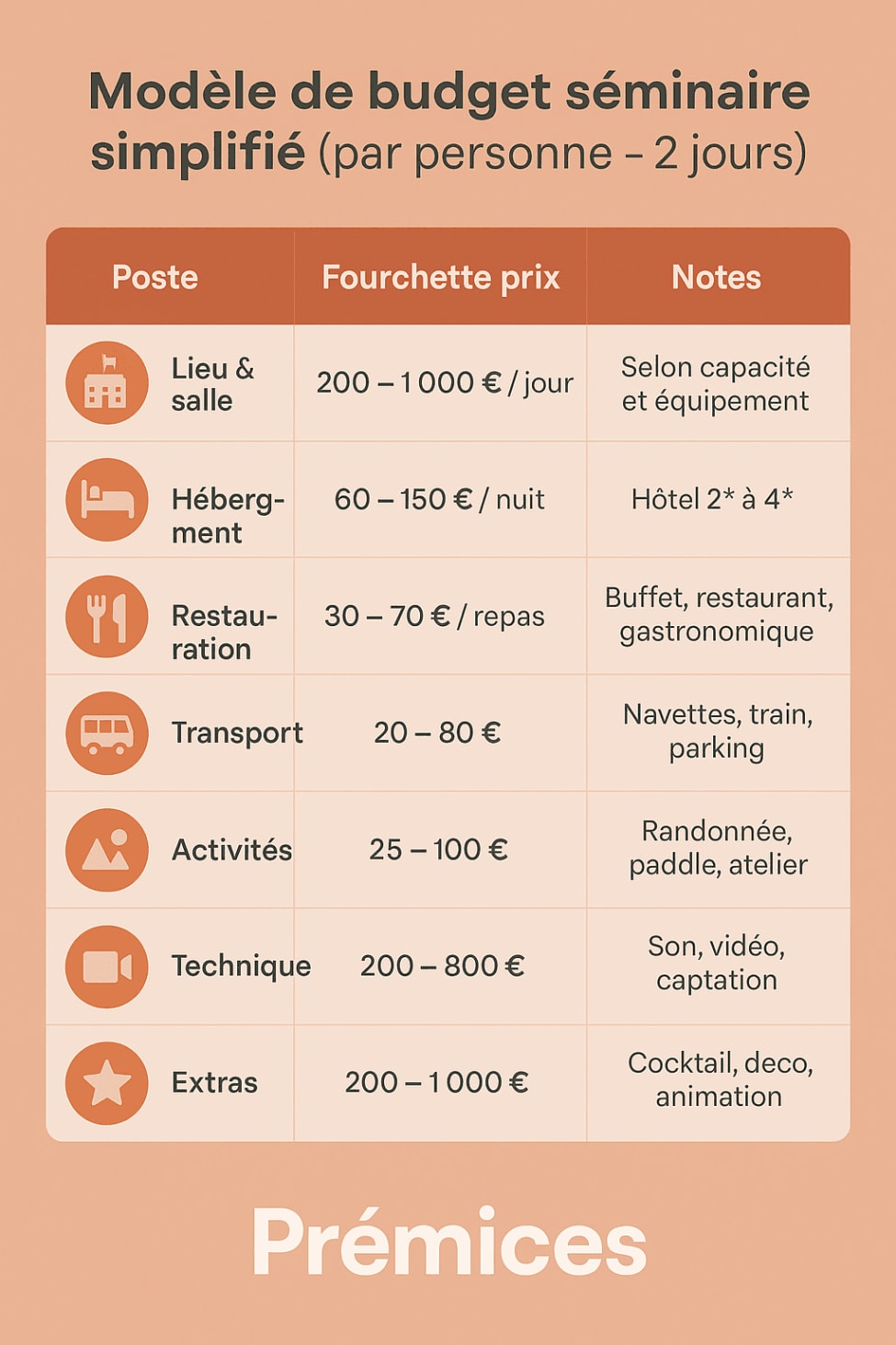Entre 150 et 400 € par personne pour 2 jours selon le standing et la saison. - Comment réduire le coût d’un séminaire ?